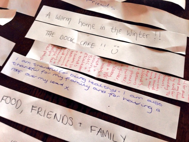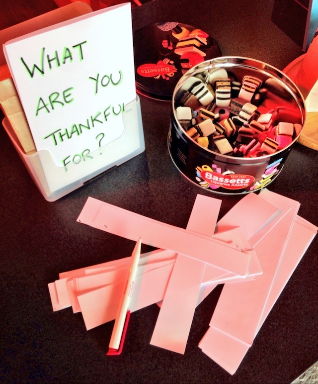 So every Dock Cafe customer today was given a Thanksgiving Liquorice Allsort and a little slip of paper to fill in their Reasons To Be Thankful…