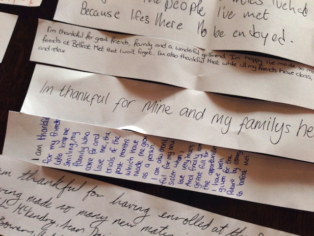How amazing and moving to glance through some of the slips of paper as they were left on the coffee bar. People whose lives have been transformed by new friendships formed at the Belfast Met, or who have found warmth and welcome in Dock Cafe. People who have endured difficult times which have made them so much more thankful for the basics of life.